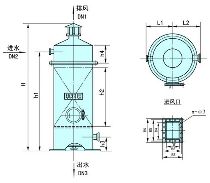 脫氣塔由進水裝置,填料,風機,水箱組成,進水裝置一般采用母支管布水,材質根據不同的需要可以選用304繞絲管和316繞絲管,填料選用多麵空心球,根據水質不同可以選用陶瓷和塑料兩種,他主要是起到加大水的表麵積,使二氧化碳較好的被吹脫、風機主要是提供風源,從而對水的二氧化碳進行吹脫、儲水箱使處理後的水儲存,可以通過增壓泵打到後續的設備中,除碳器工作時,水從上部進入,經配水裝置淋下,通過填料層後,從下部排入水箱,而風機的提供的風向是逆向的,即從下向上進行吹脫,通過填料層後,由頂部排出。其原理所以當鼓入除碳器的空氣流和除碳水相接觸時,水中CO2便會被空氣流帶出。